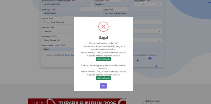 TULANG BAWANG BARAT (TERAS INFORMASI) – Antusiasme masyarakat yang sangat tinggi mengikuti event Tubaba FUN RUN 2026 membuat sistem registrasi online sempat mengalami gangguan.